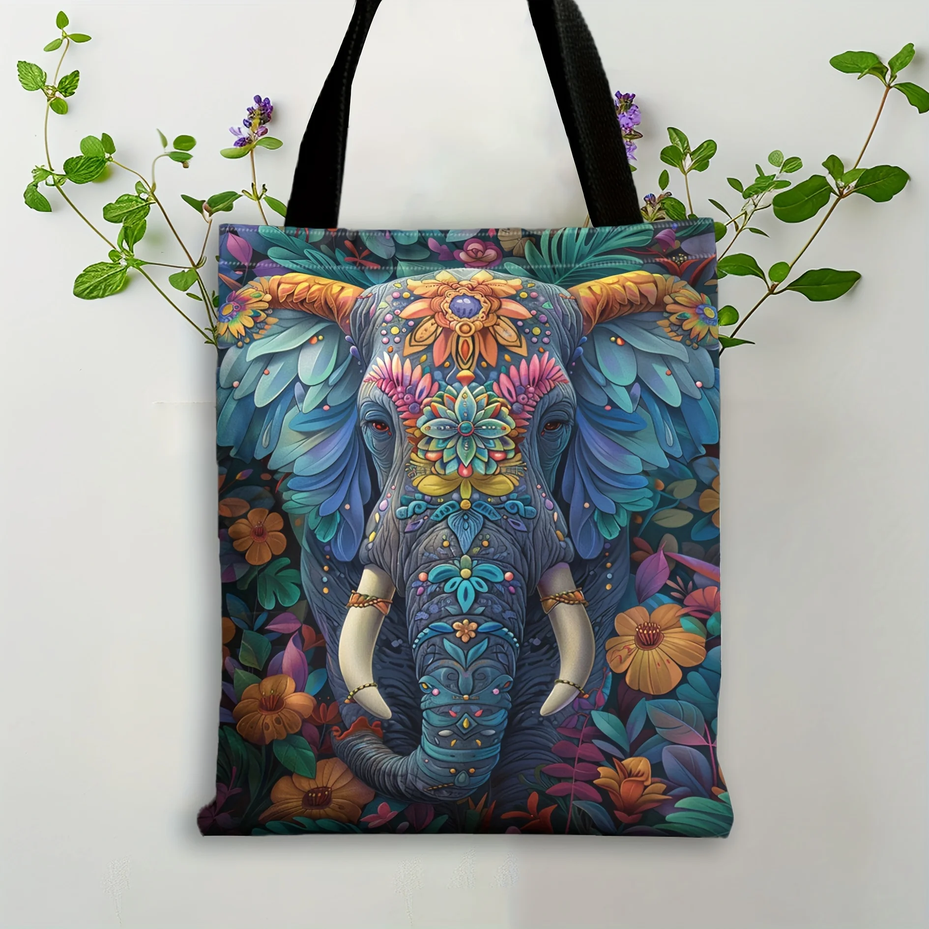 1pc Flowers with Elephant Pattern Tote Bag