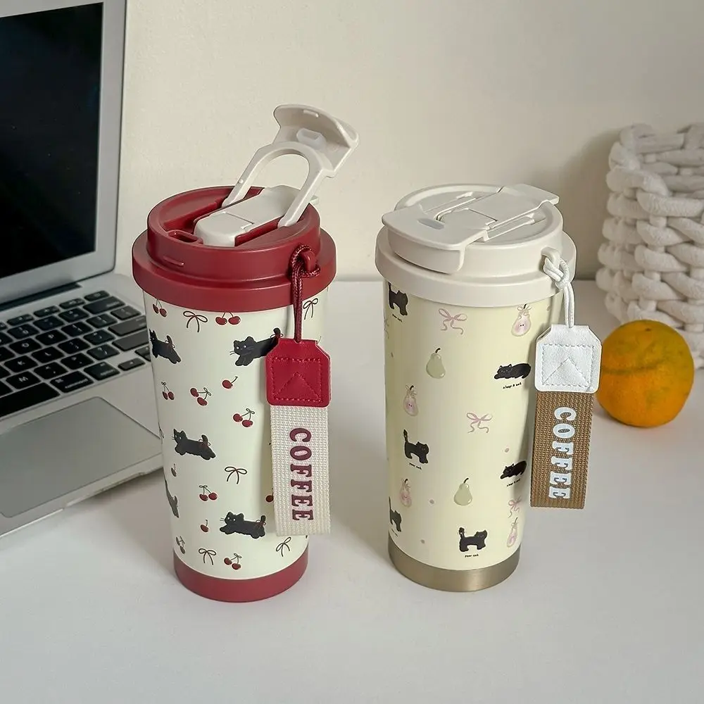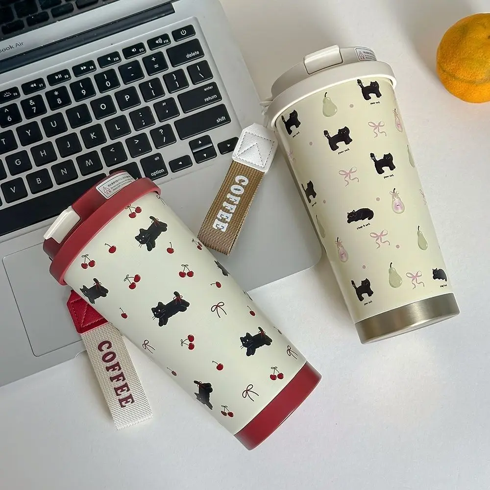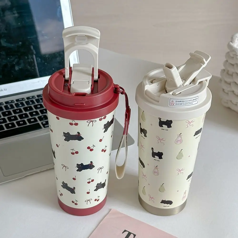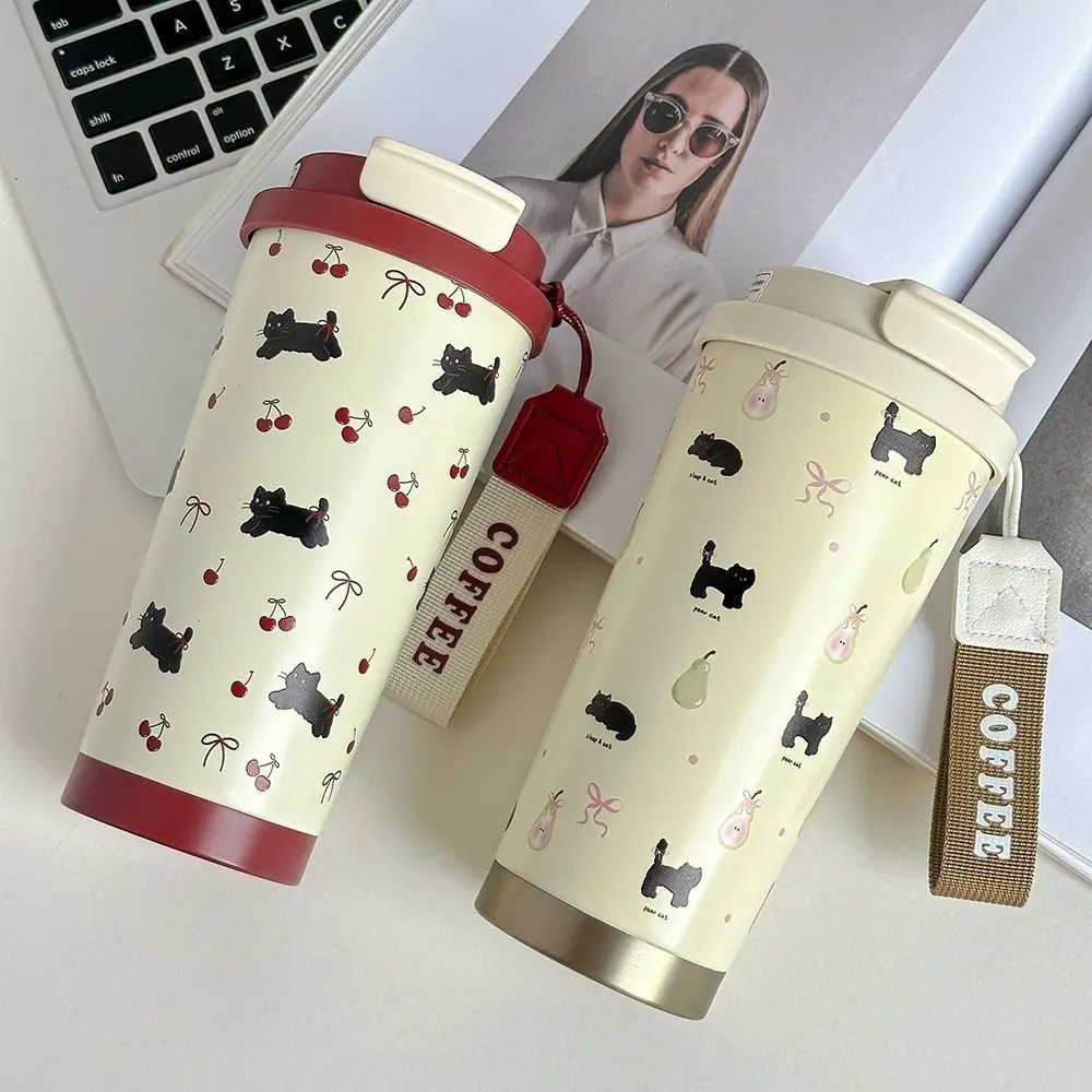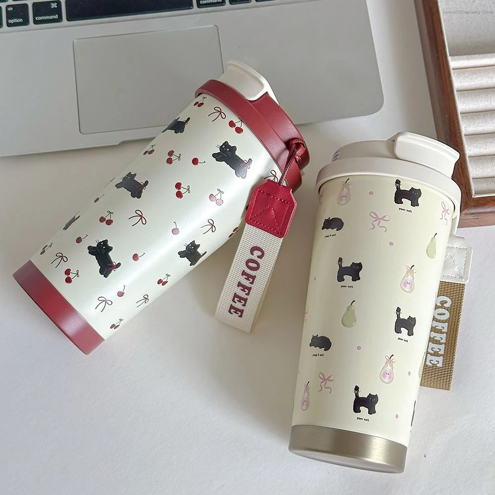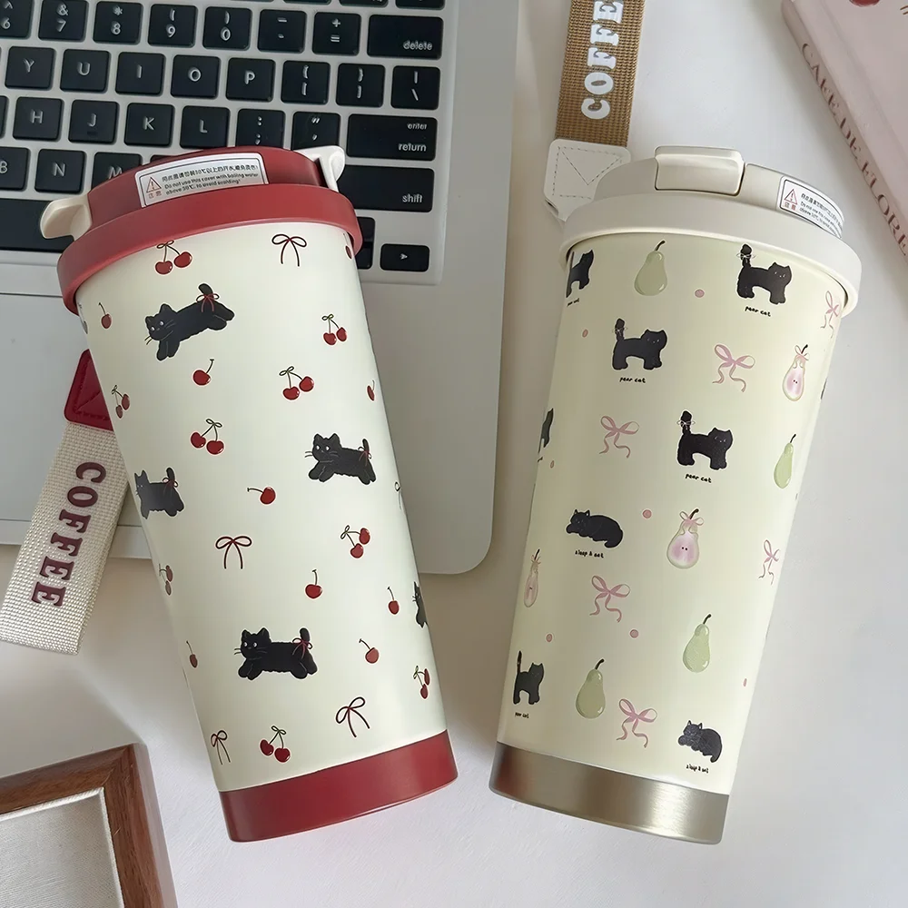 Cute Cherry Cat Tumbler 500ml Kawaii Water Bottle Stainless Steel Thermos With Straw Portable Thermal Cup For Coffee Tea Gift